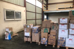 Après de nombreux jours de tri de mise en carton d’enregistrement, le convoi est prêt à partir avec ses 300 cartons. De nombreux bénévoles de l’association y ont participé
